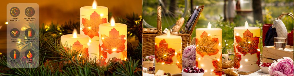 - Flameless Candles-maple leaf embedded starlight string technology: each candle is wrapped in a silver filament lamp. These light strings consist of 12 to 16 LED fairy lights.